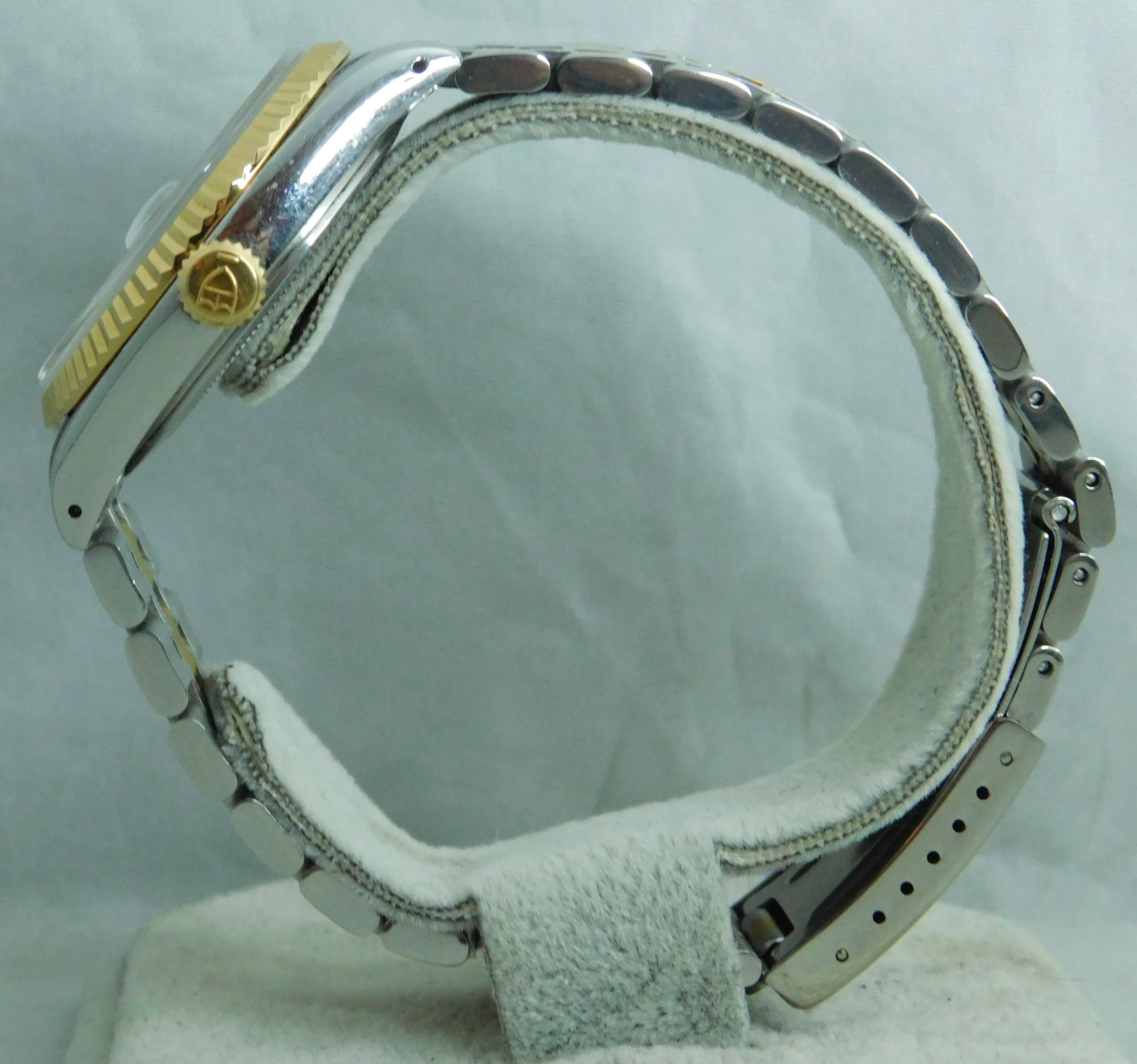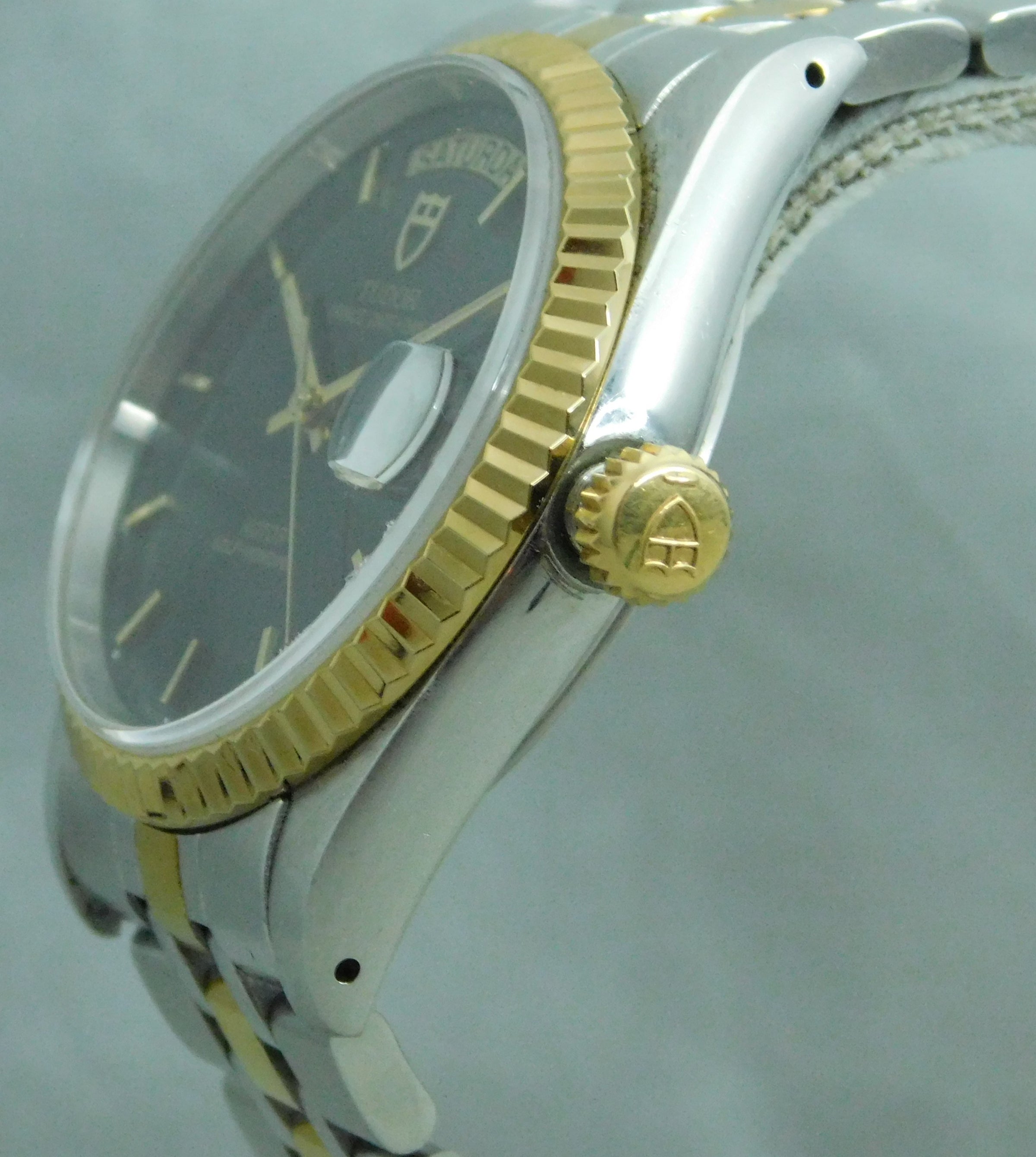 Overall Condition: mint condition ~ signed clean black dial ~ signed recently serviced swiss automatic 25 jewel movement runs strong and accurate ~ signed crown winds, sets, and screws down smoothly ~ clean sapphire crystal ~ all functions working properly ~ no gold wearing off anywhere ~ no dents ~ no dings ~ no damage ~ fluted aftermarket bezel ~ all of our watches have been tested and serviced if needed ~ stunning ~ it is a very honest piece ~ *crown pulled out to prevent hands from moving during photo taking*
