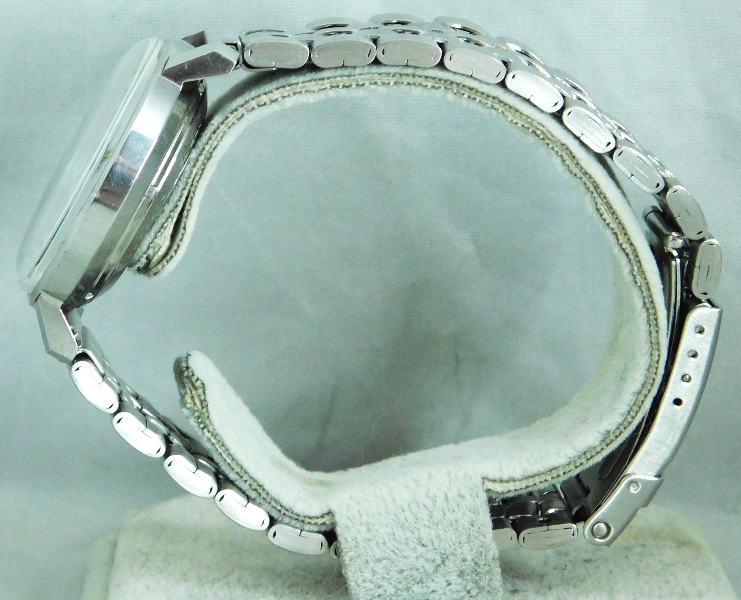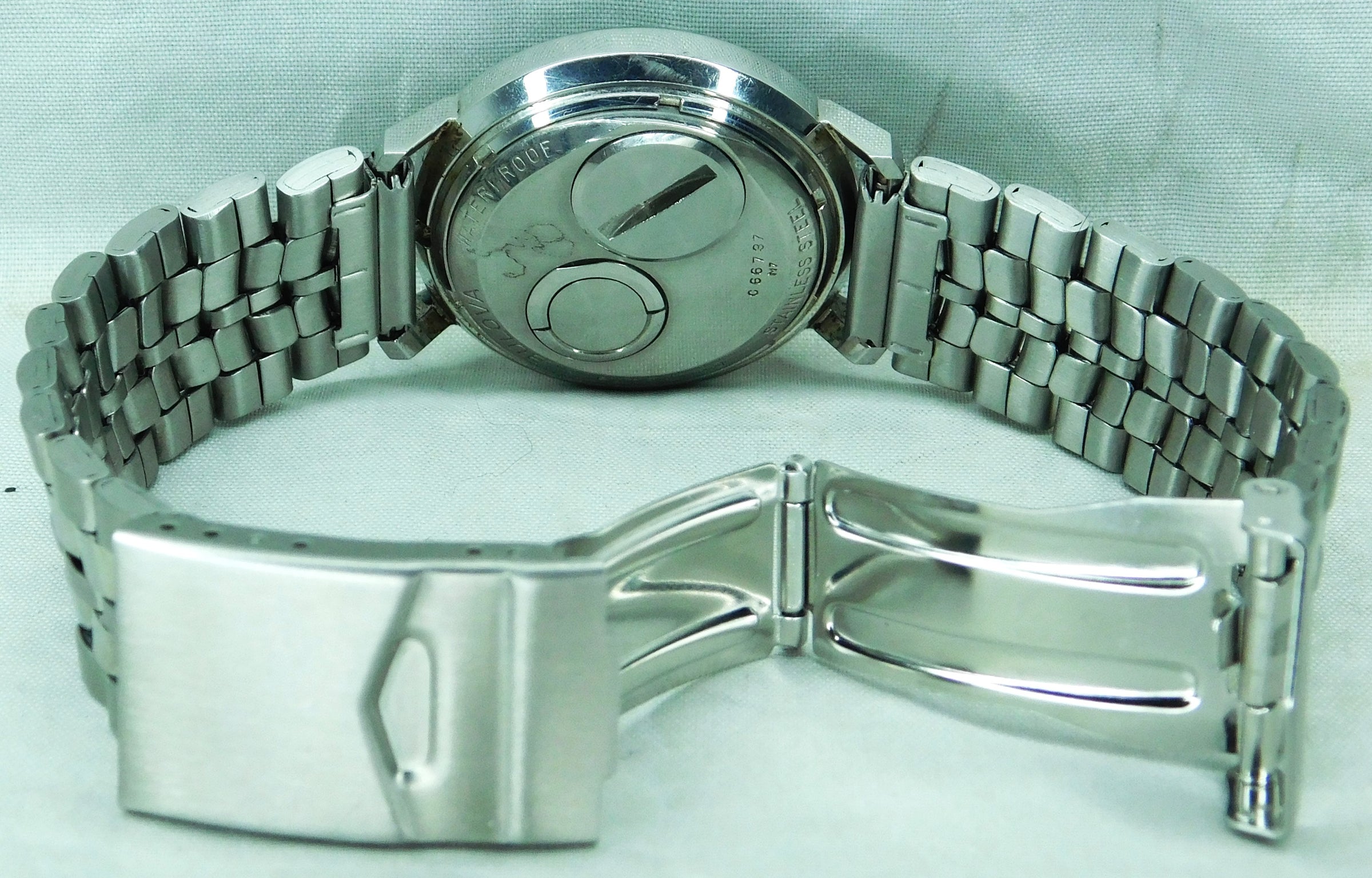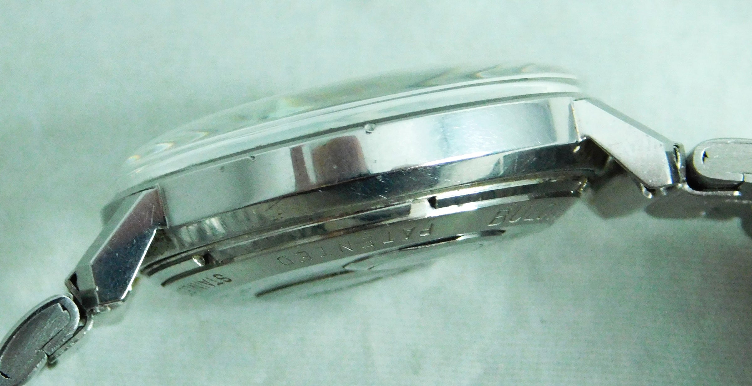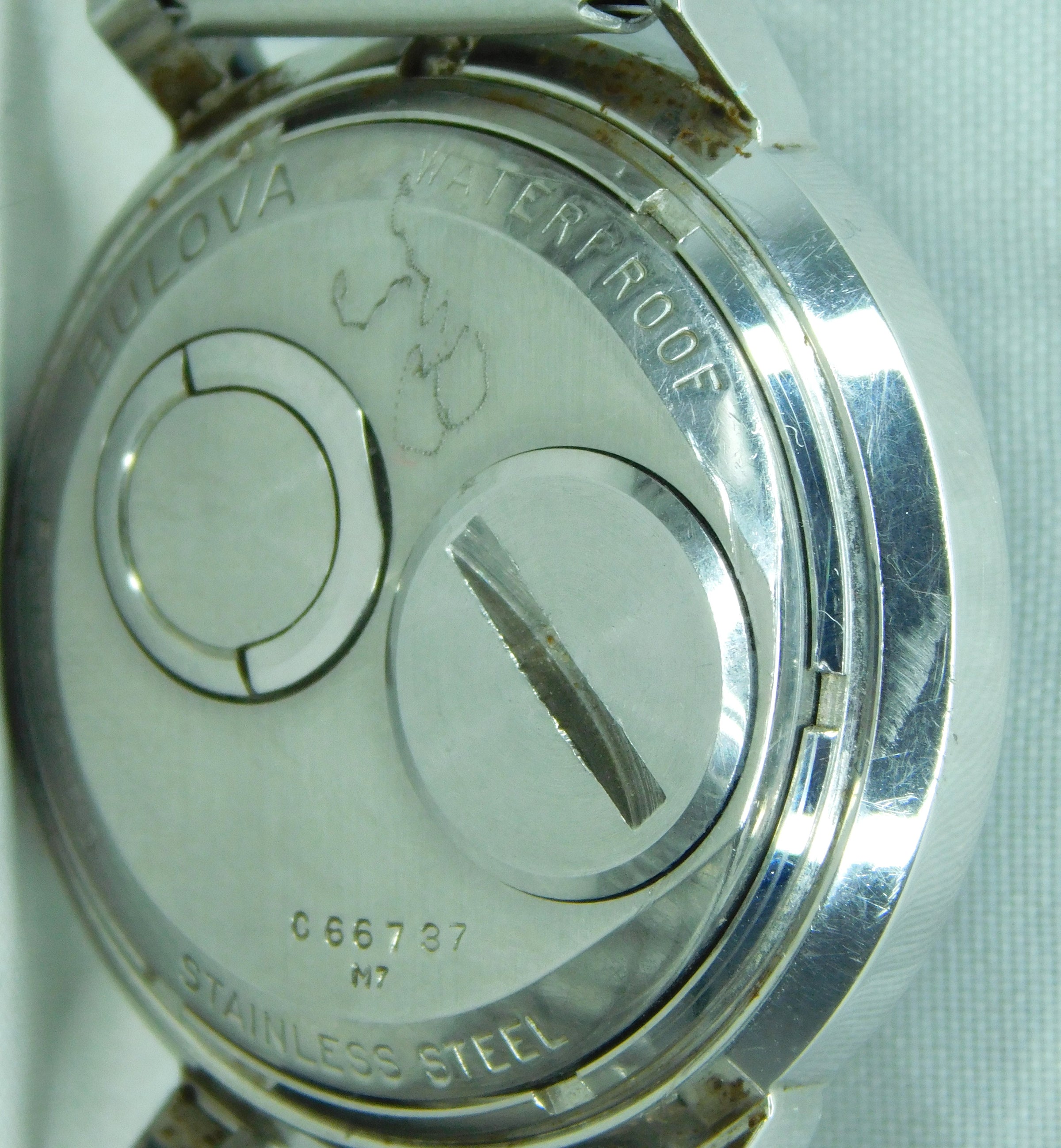 Bulova started offering more models towards the mid 1960s. Pictured here is a stainless steel USA model. This model used a reflector ring to mark minutes/seconds. It also used longer white "Spear" hands