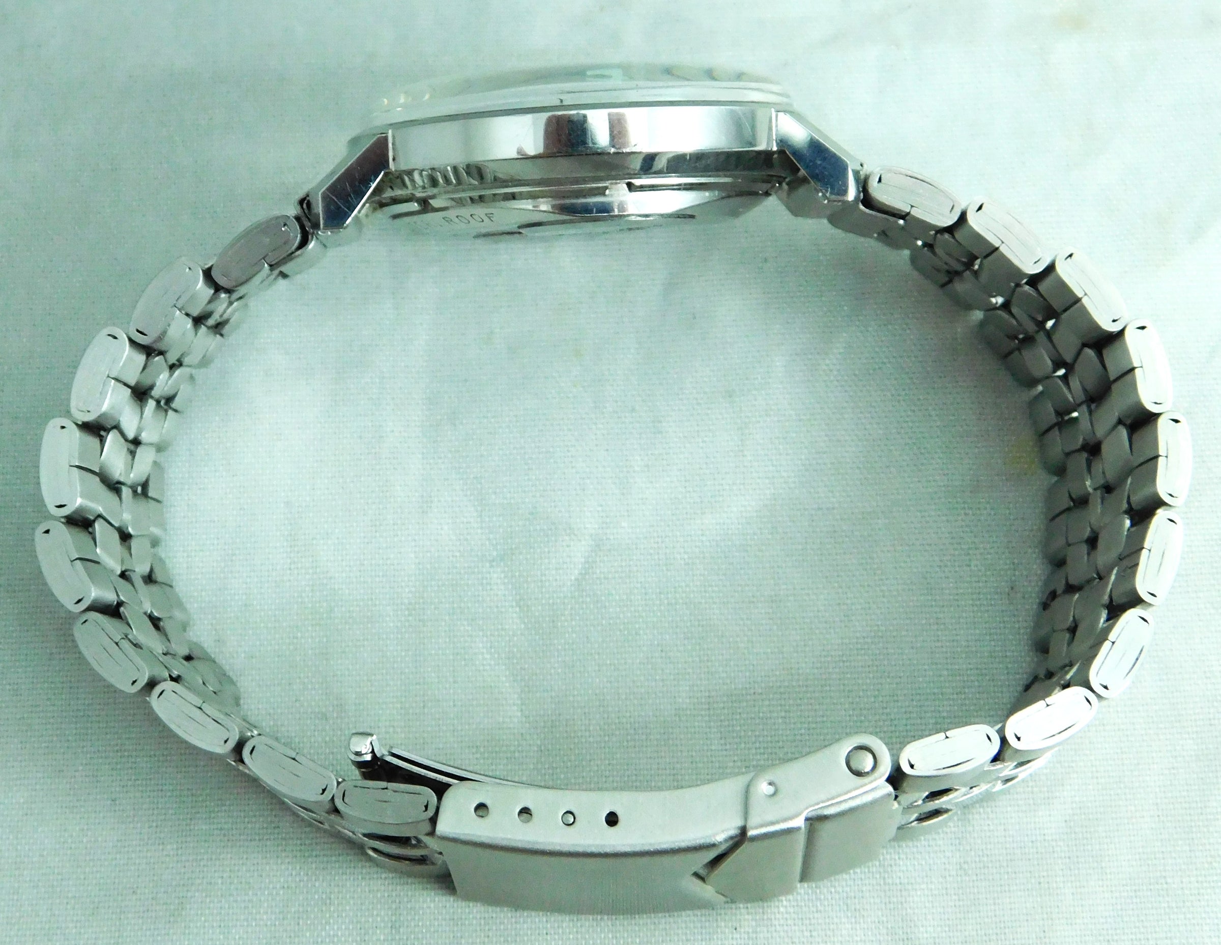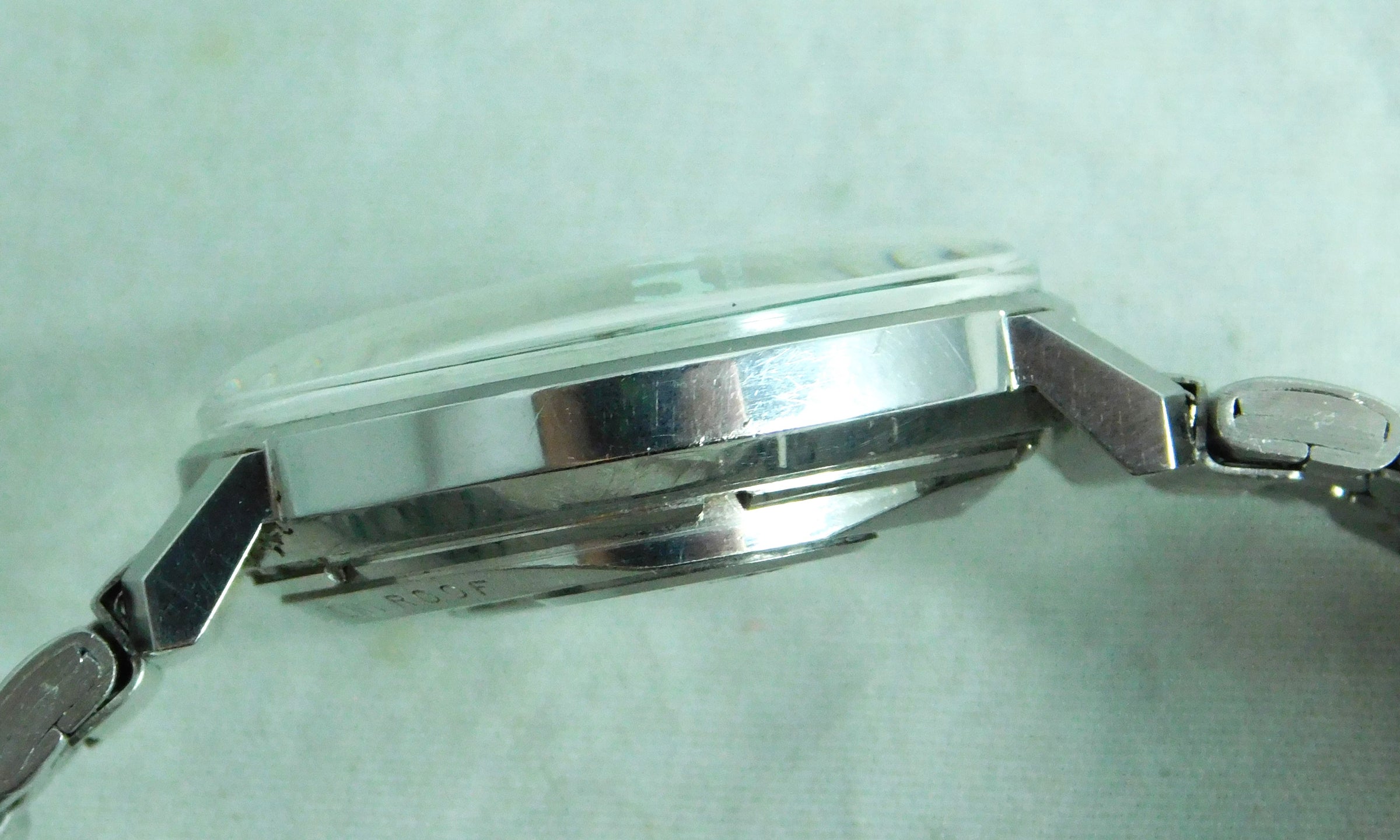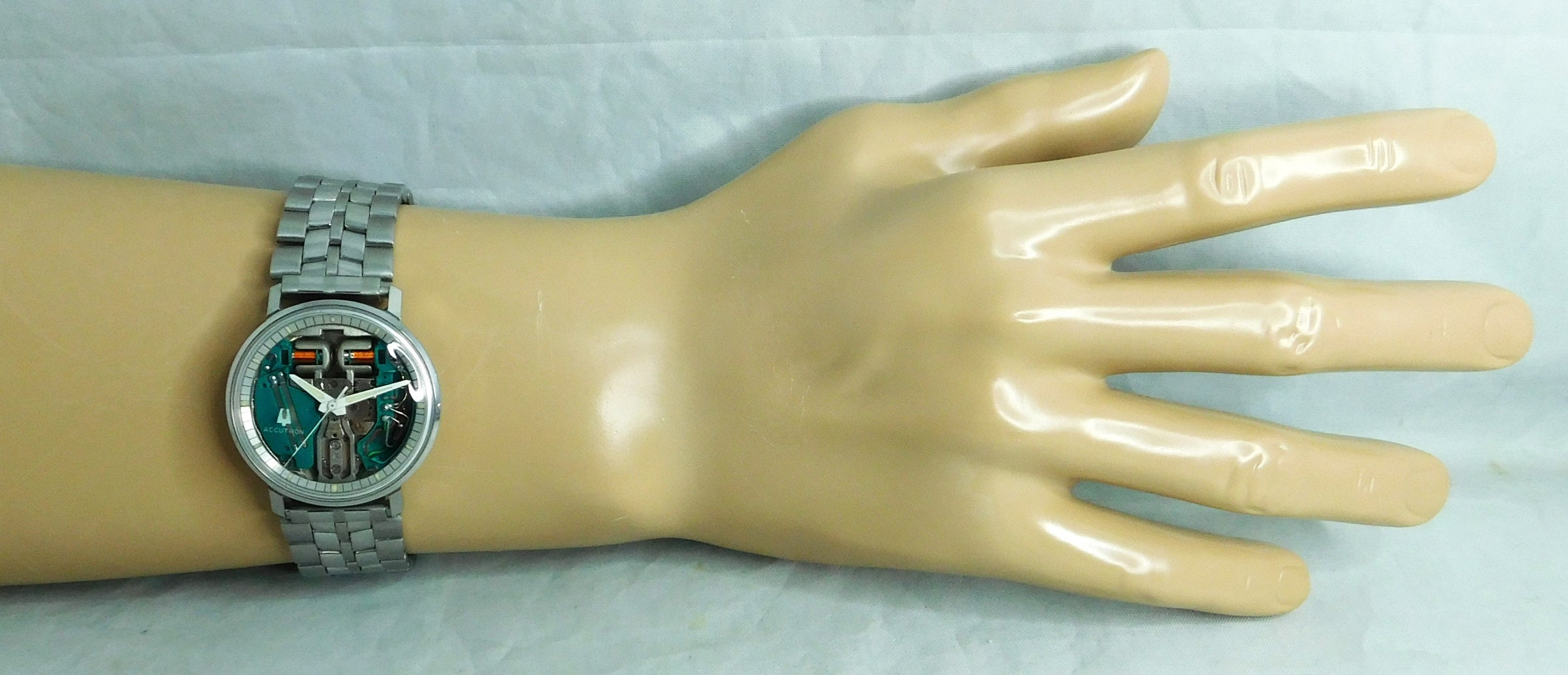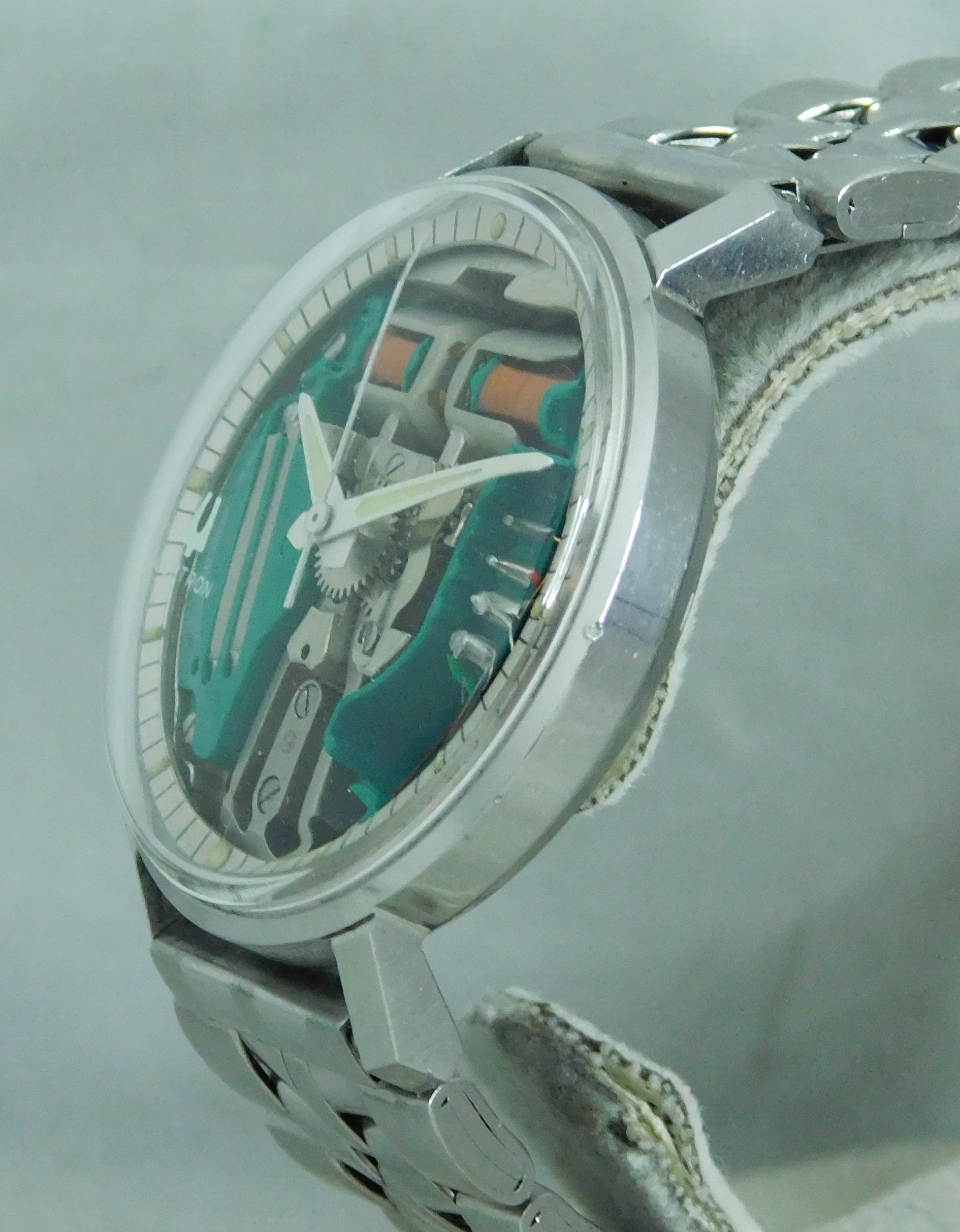 Bulova started offering more models towards the mid 1960s. Pictured here is a stainless steel USA model. This model used a reflector ring to mark minutes/seconds. It also used longer white "Spear" hands