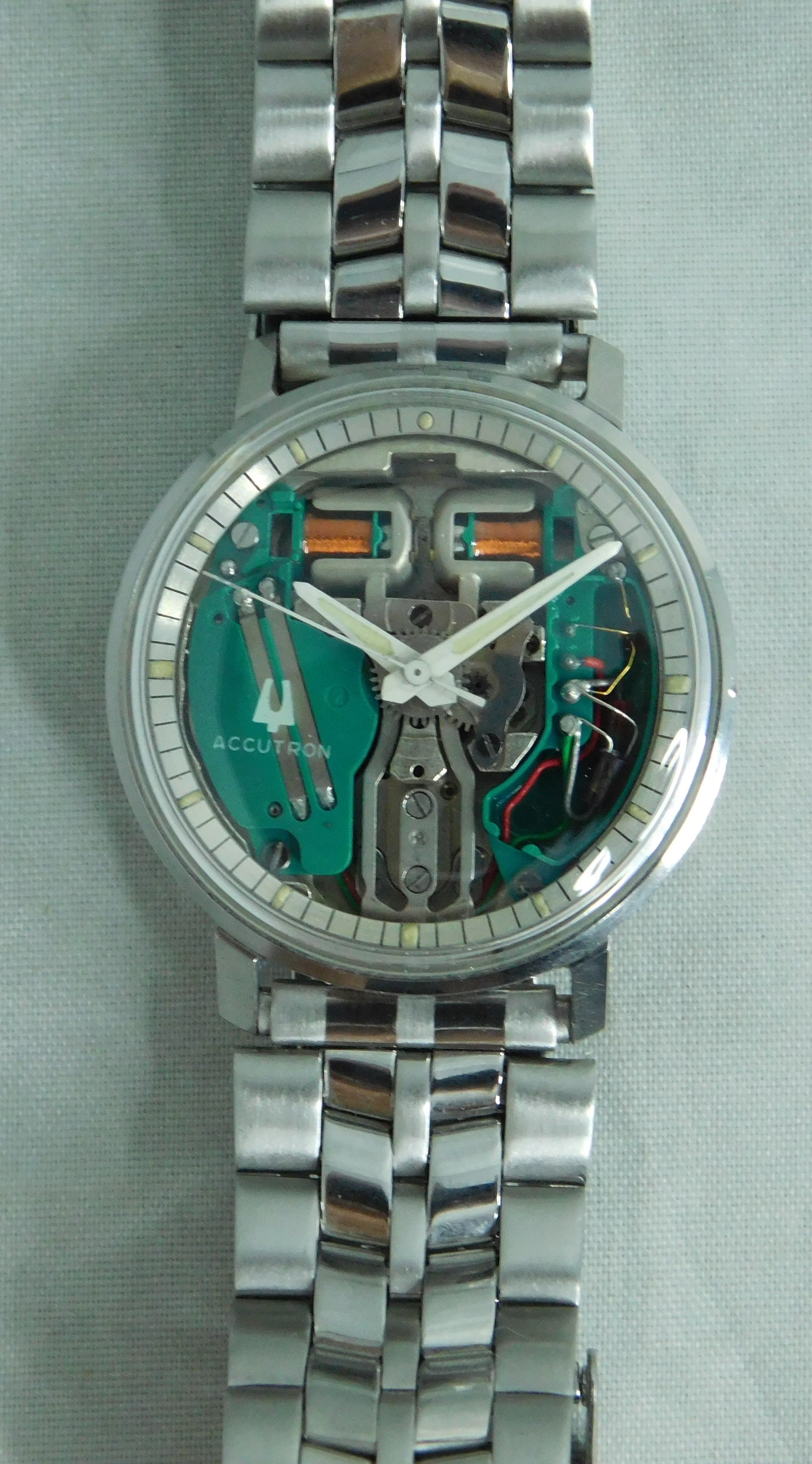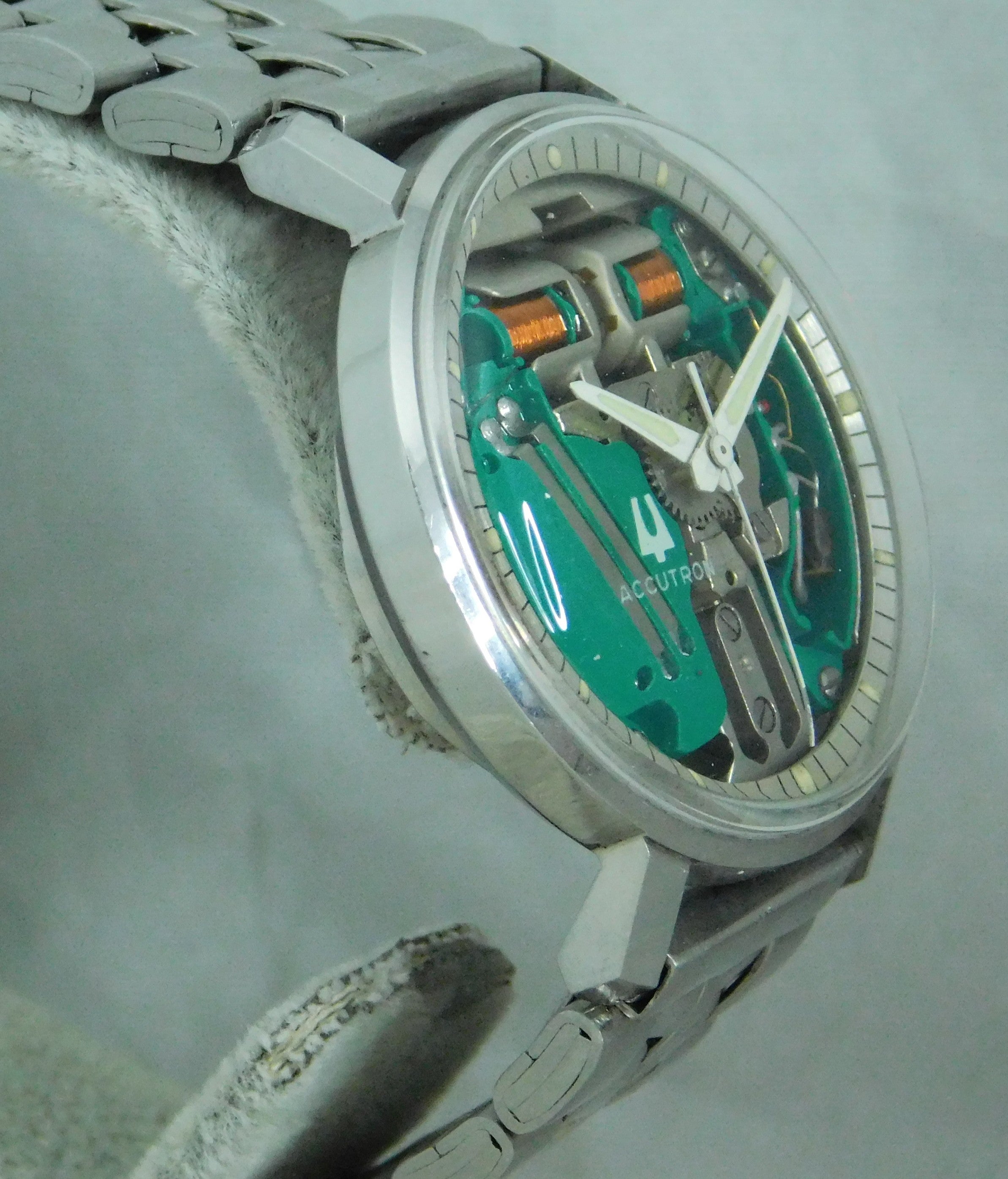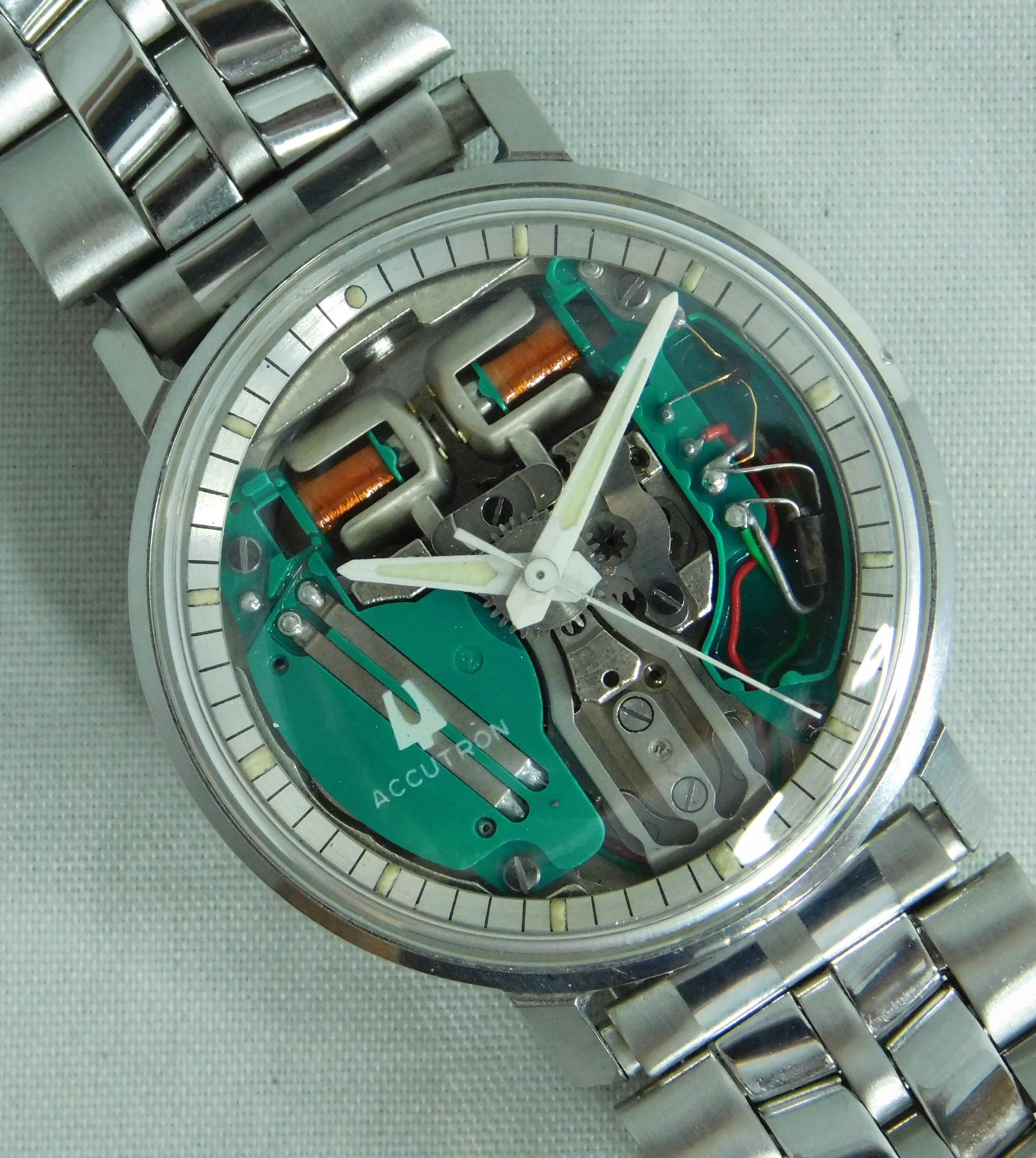 Overall Condition: excellent condition ~ fully rebuilt and restored tuning fork movement runs strong and accurate ~ new battery ~ clean acrylic crystal ~ all functions working properly ~  case has a couple very small dings on one side ~ comes with a nos (new old stock) genuine green accutron strap ~ no damage ~ stunning