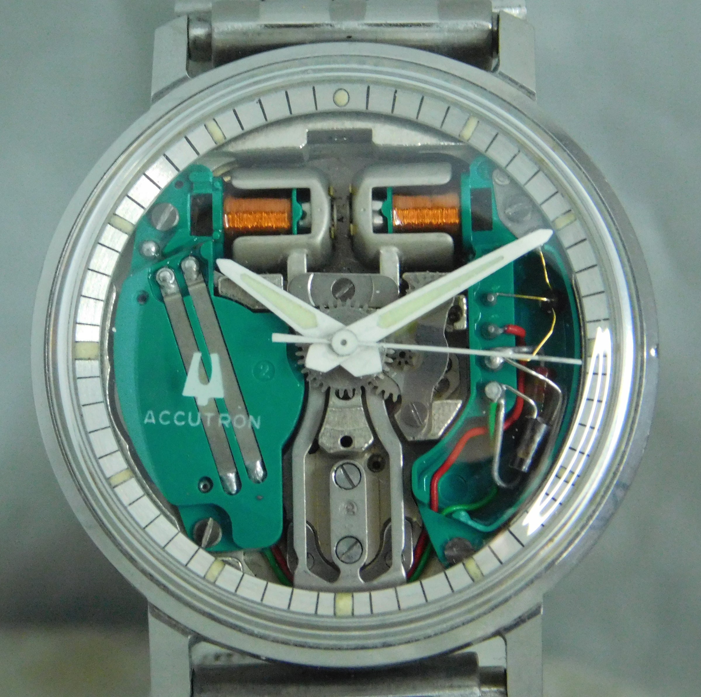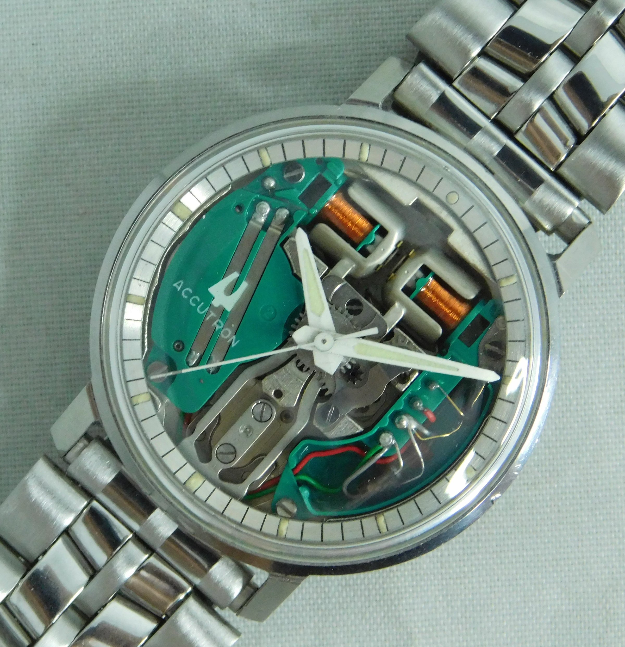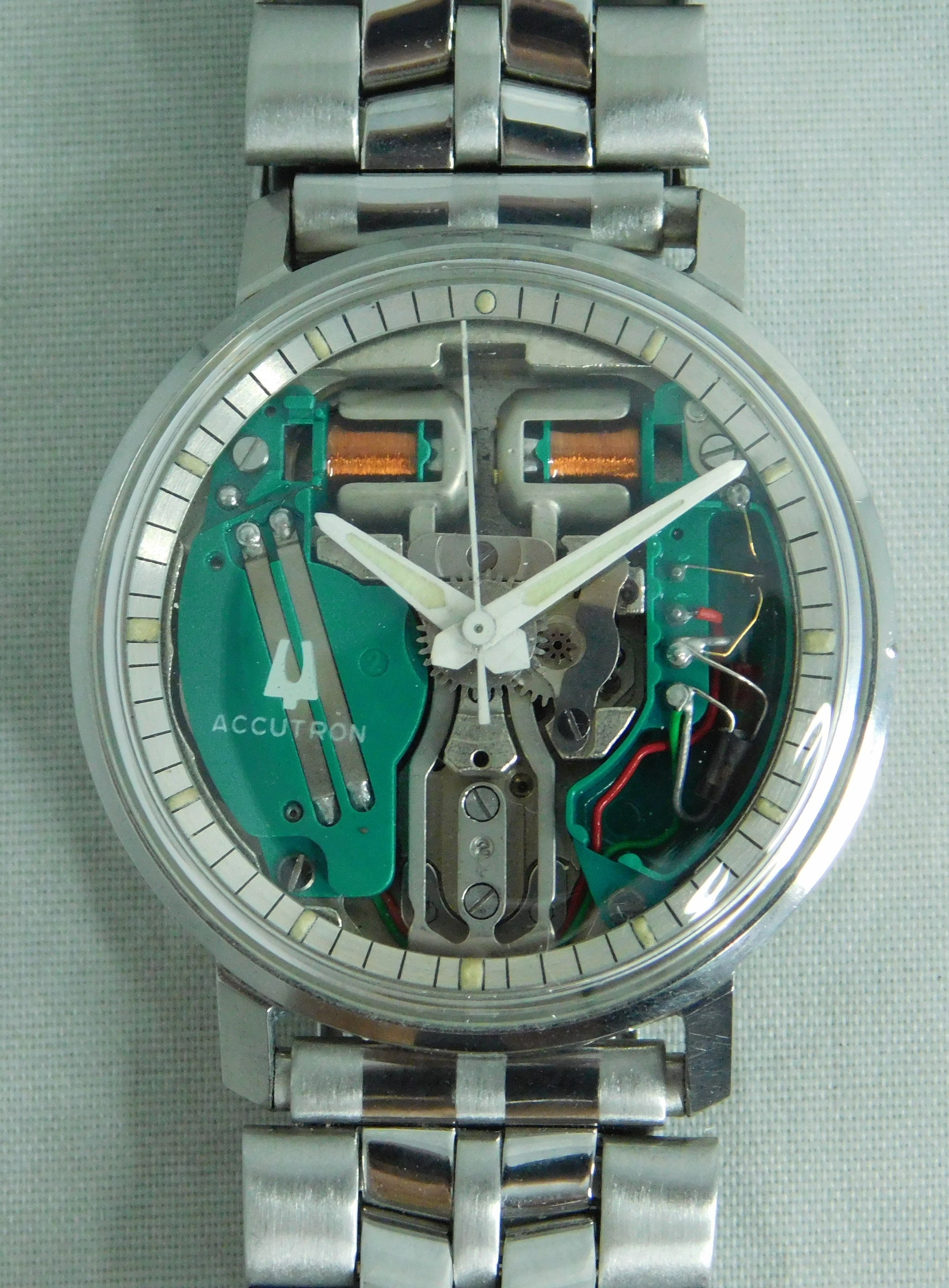 Overall Condition: excellent condition ~ fully rebuilt and restored tuning fork movement runs strong and accurate ~ new battery ~ clean acrylic crystal ~ all functions working properly ~  case has a couple very small dings on one side ~ comes with a nos (new old stock) genuine green accutron strap ~ no damage ~ stunning