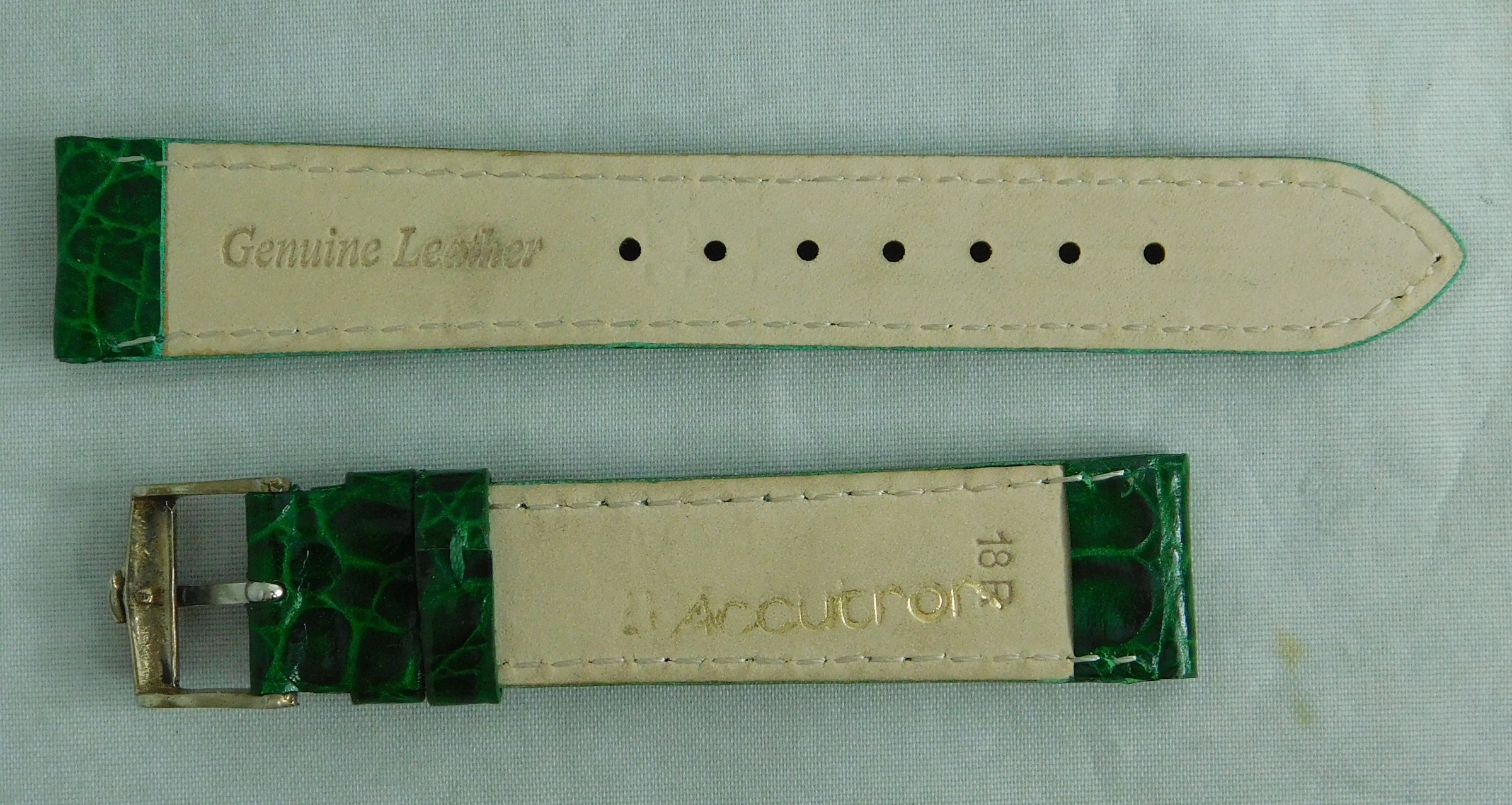 Bracelet Specifications: This watch uses a generic 18mm bracelet that will fit a wrist up to 8.5" ~ can be adjusted smaller ~ or you could easily replace it with the nos (new old stock) genuine green accutron strap that is included