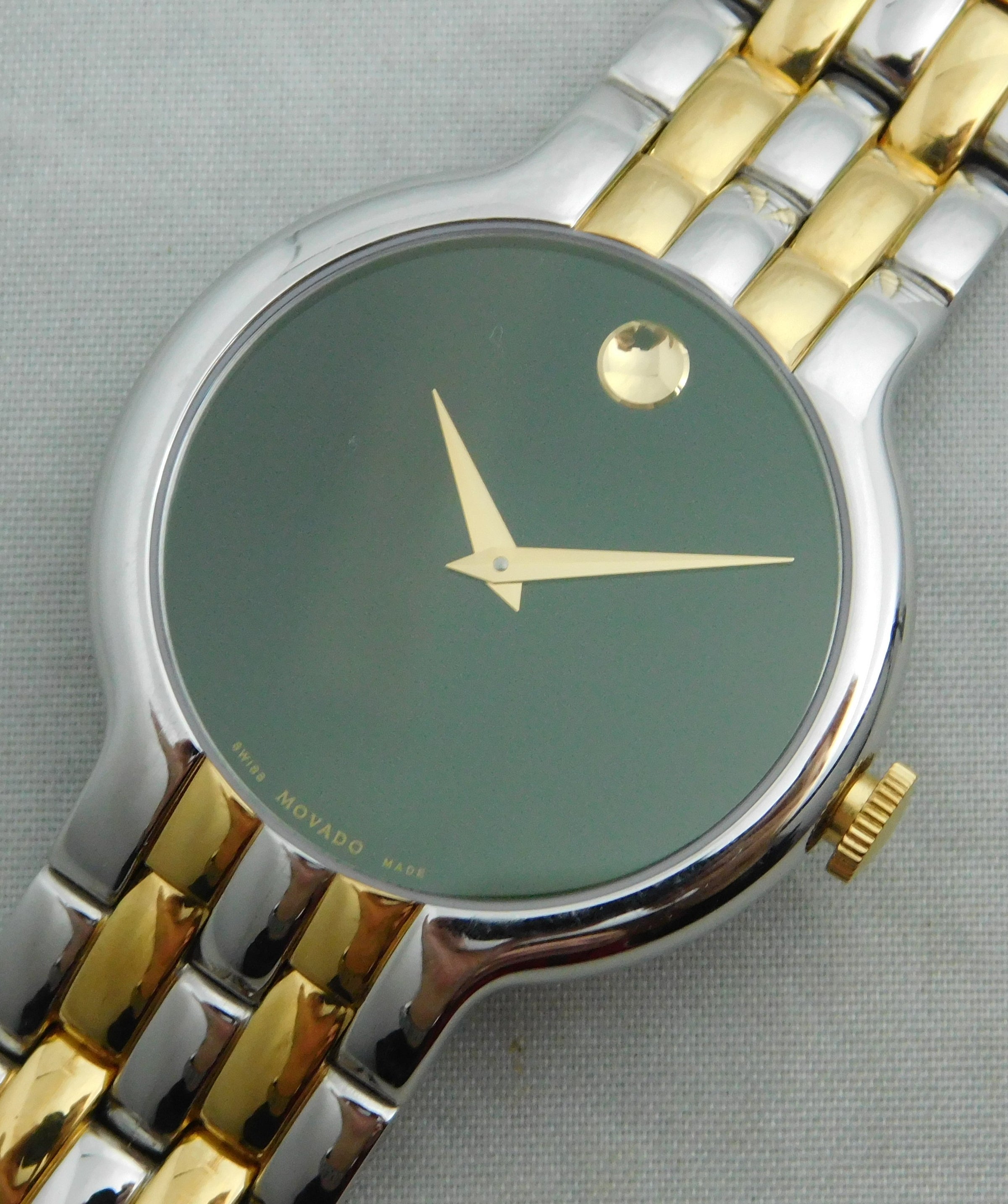 The Movado Museum Black Dial Two Tone Bracelet Mens Watch....38mm is the yin, to your yang. You've found what you're looking for.