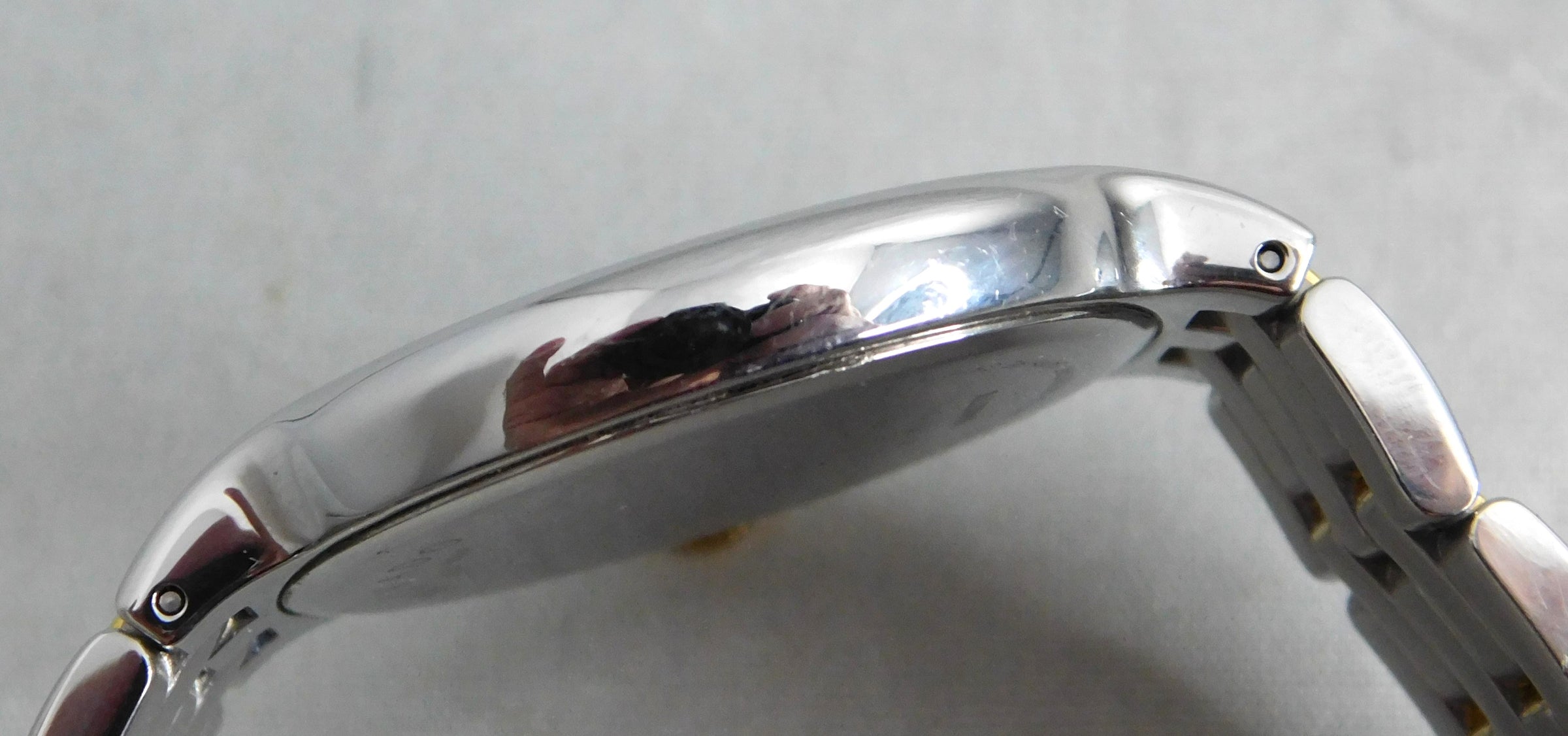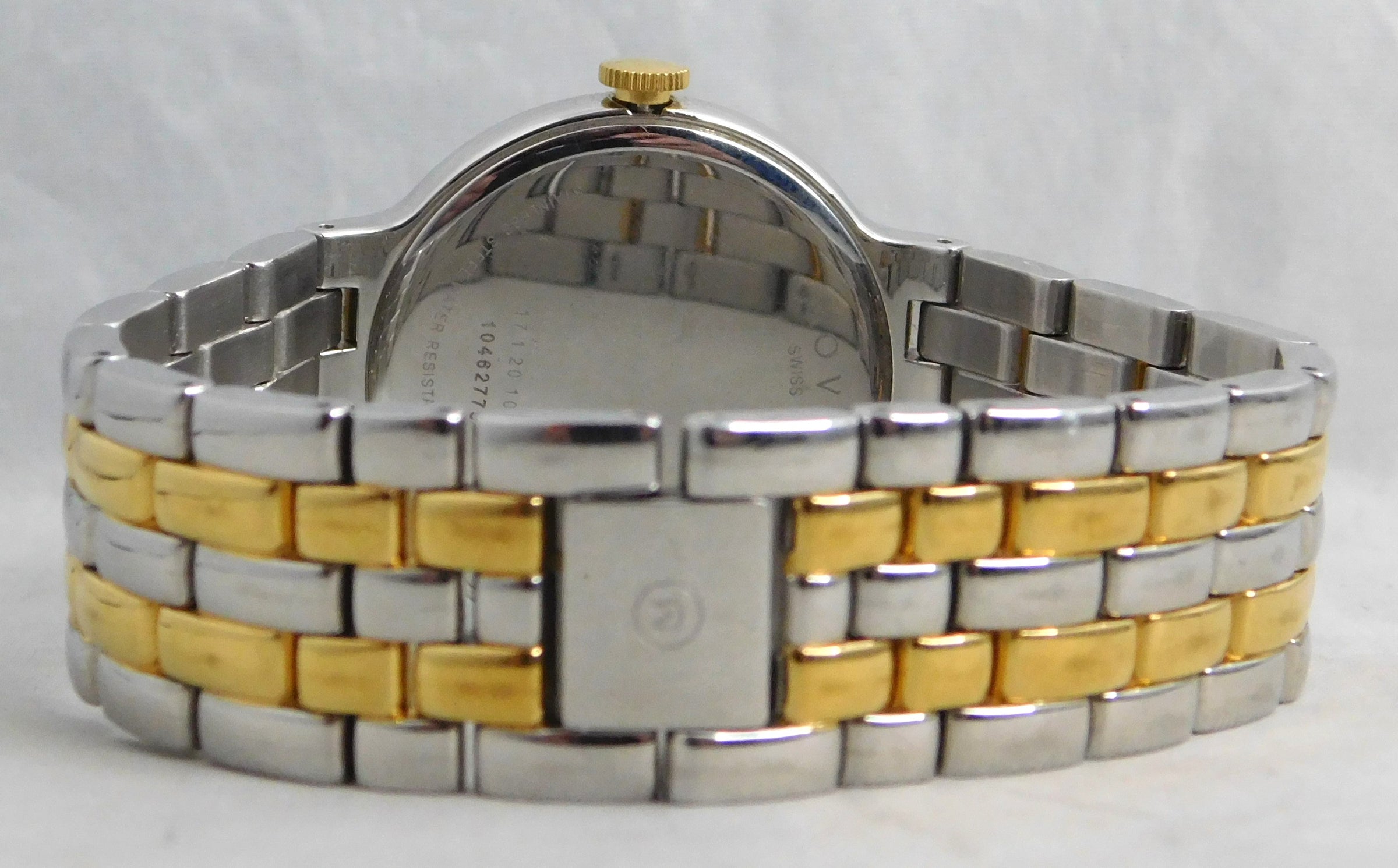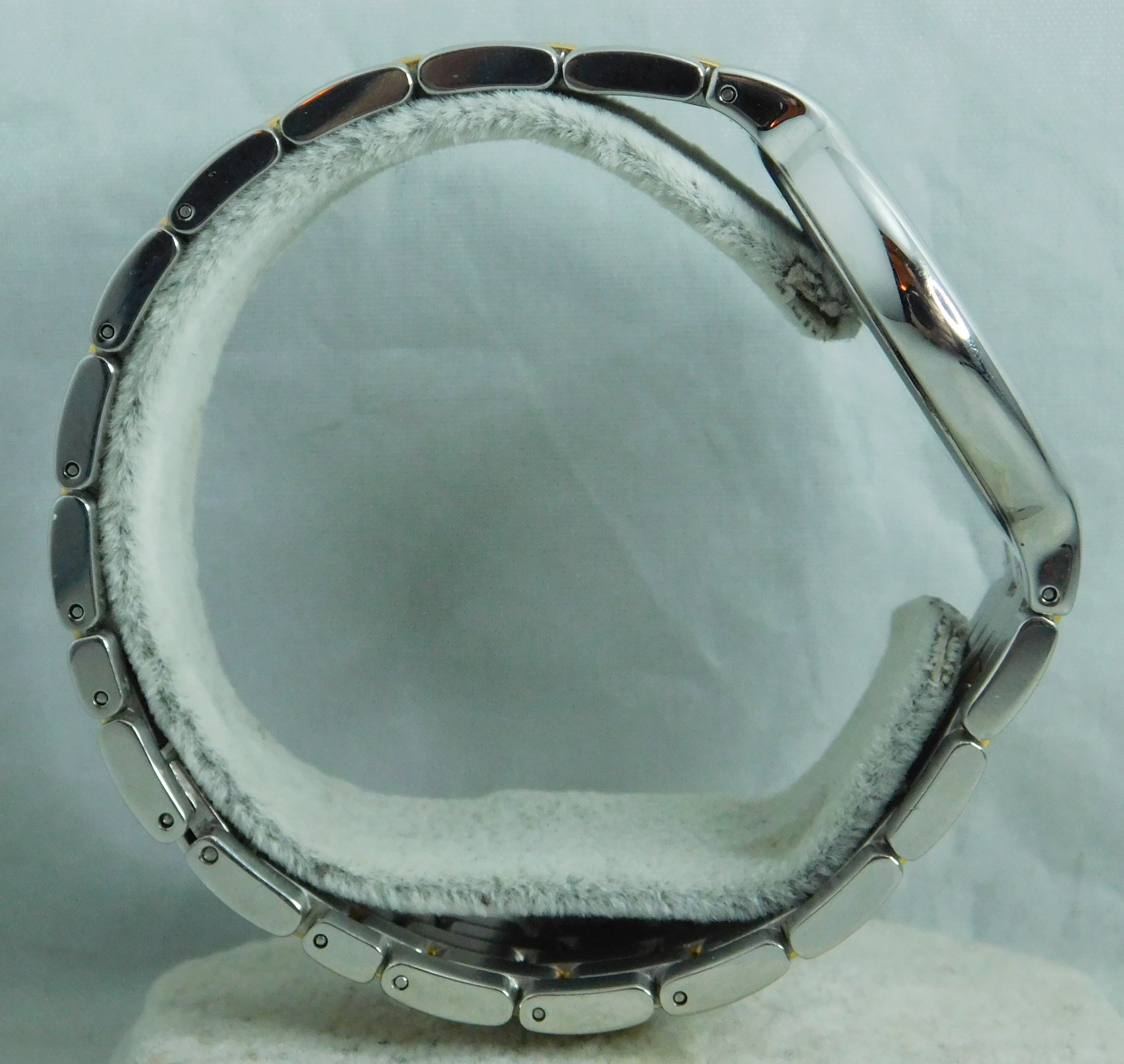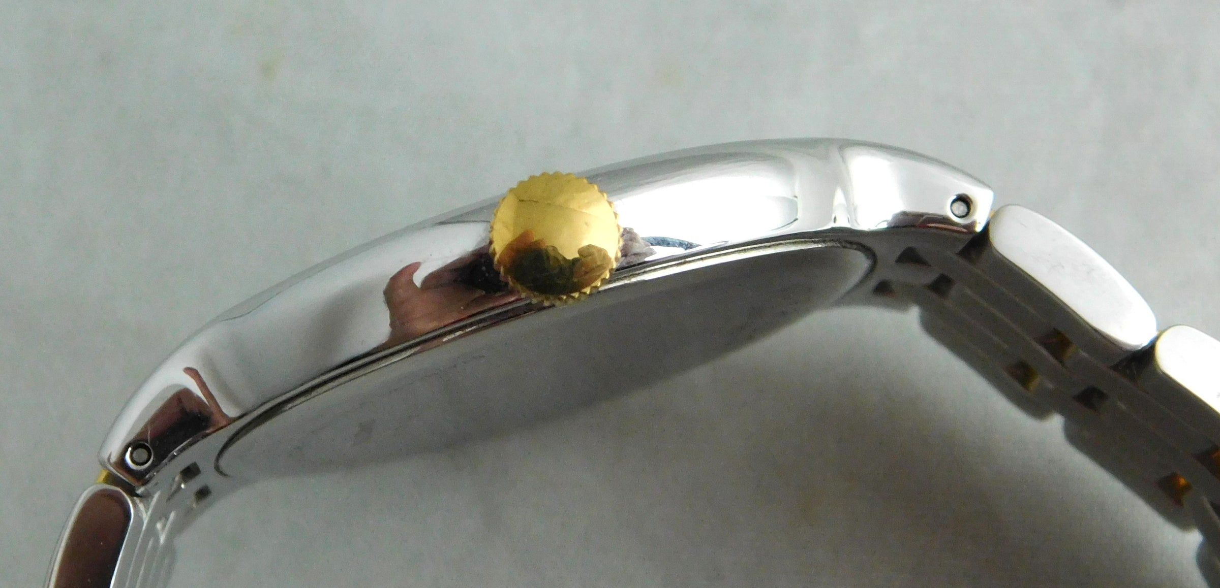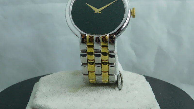 Overall Condition: excellent condition ~ signed clean black dial ~ signed swiss quartz (battery operated) movement runs strong and accurate ~ crown sets the time smoothly ~ clean sapphire crystal ~ no gold wearing off anywhere ~ no dents ~ no damage ~ all of our watches have been tested and serviced if needed ~ stunning ~ it is a very honest piece ~ *crown pulled out to prevent hands from moving during photo taking*